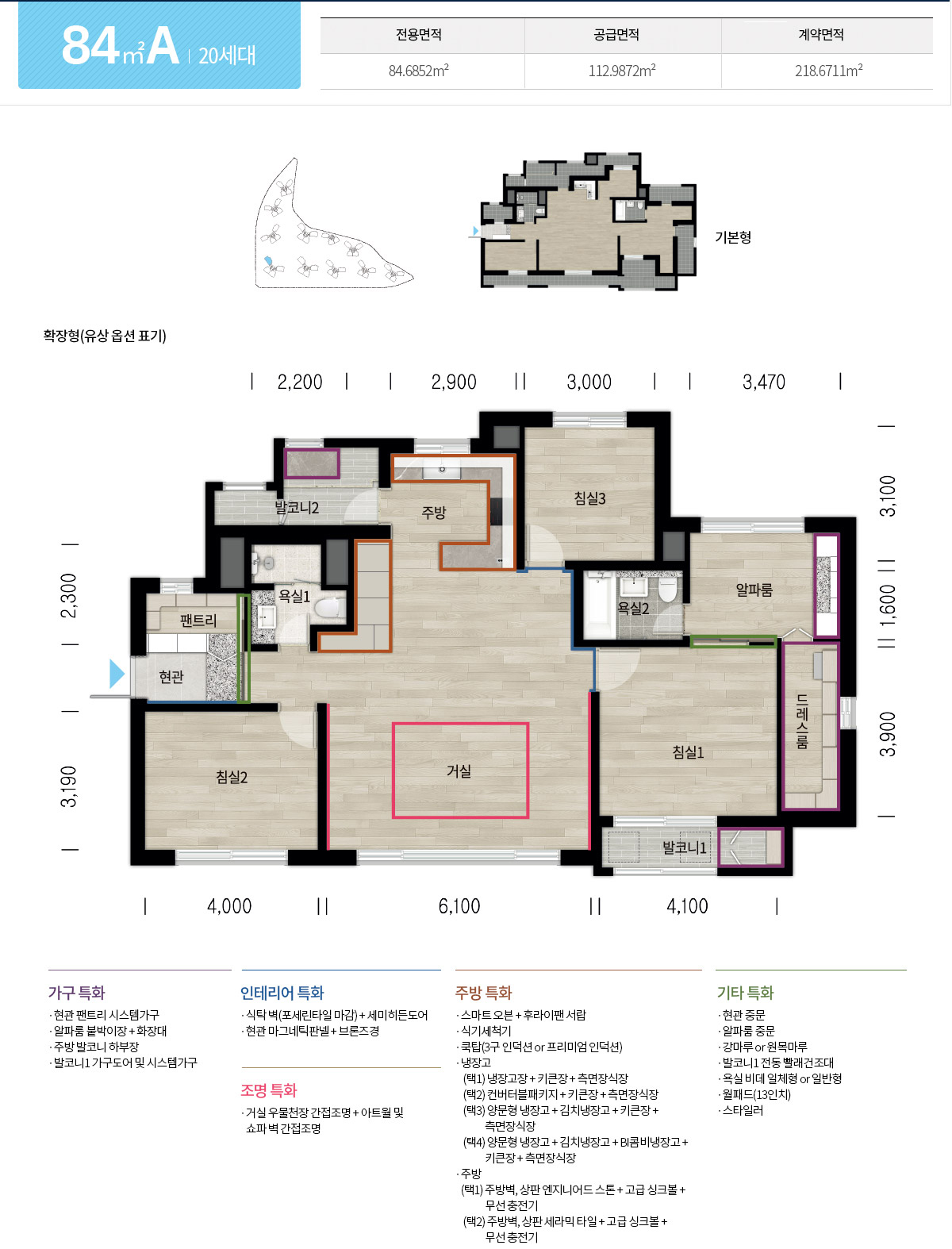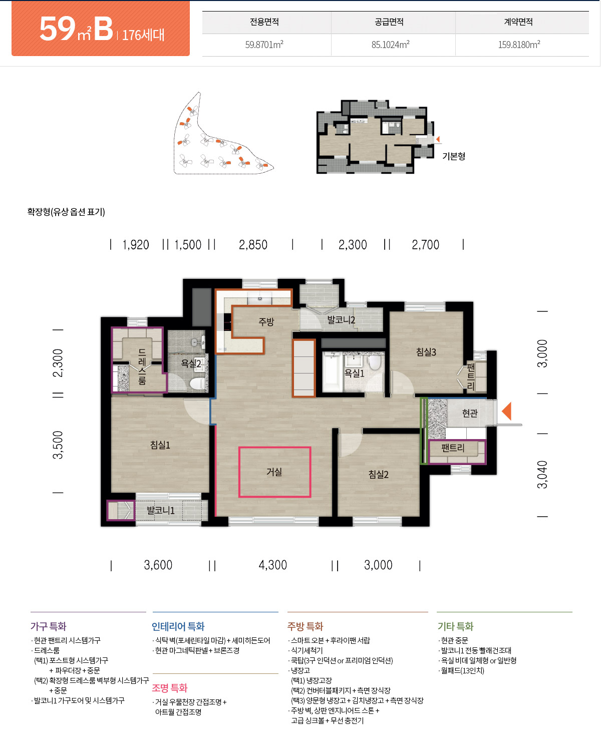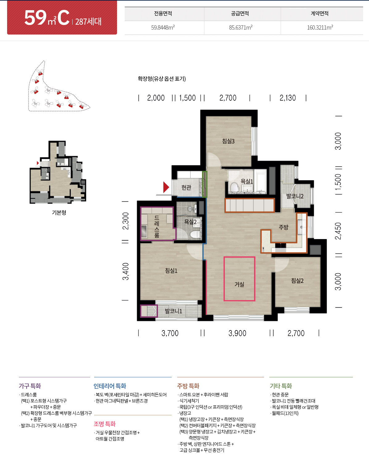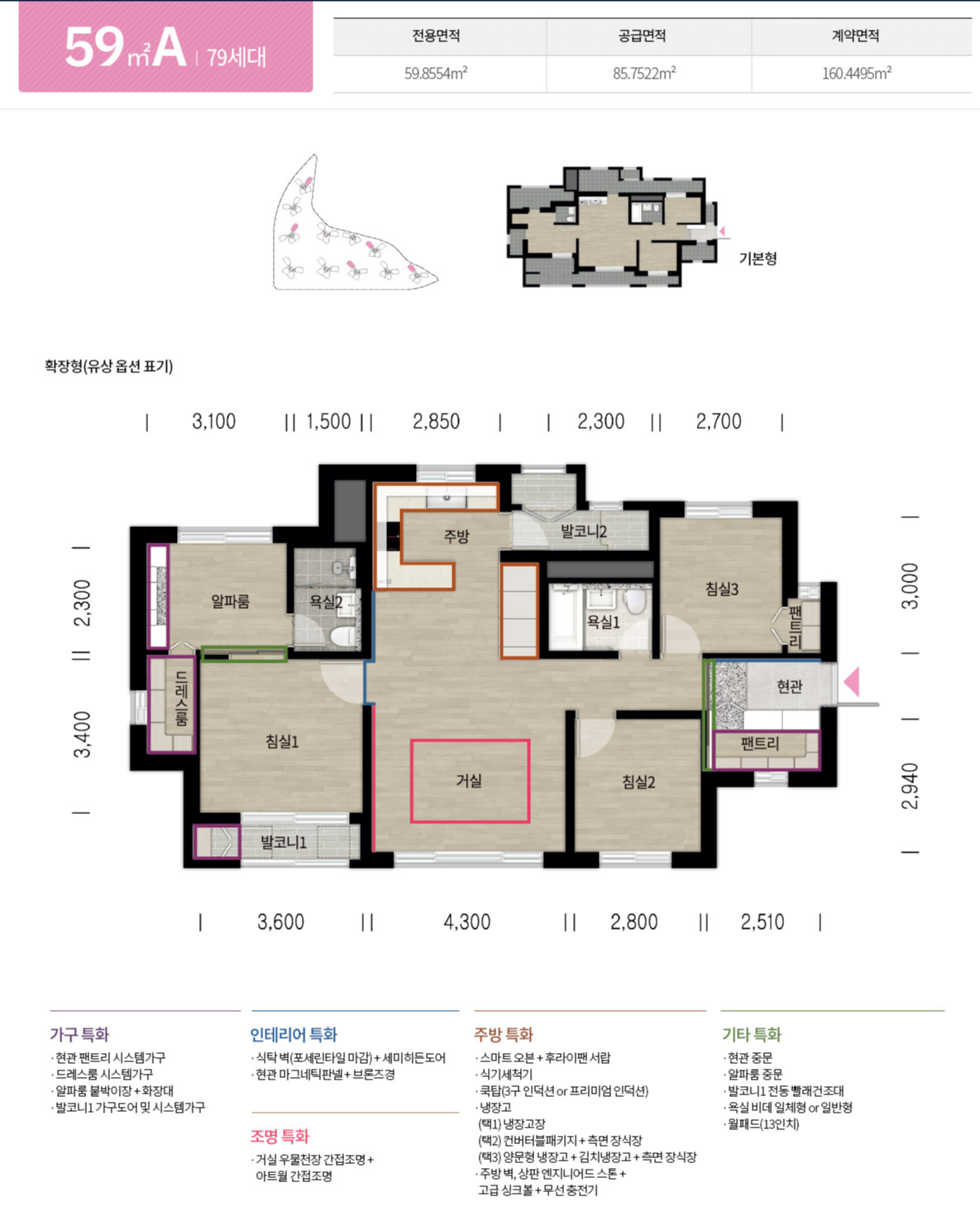 선호도가 높은 전용 59타입 세가지와 84타입 세가지로 나뉘어 공급됩니다.