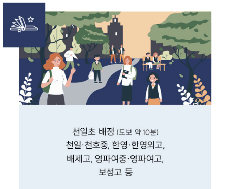 인근 가장 가까운 초등학교로는 약 900m에 천일초등학교가 있습니다.