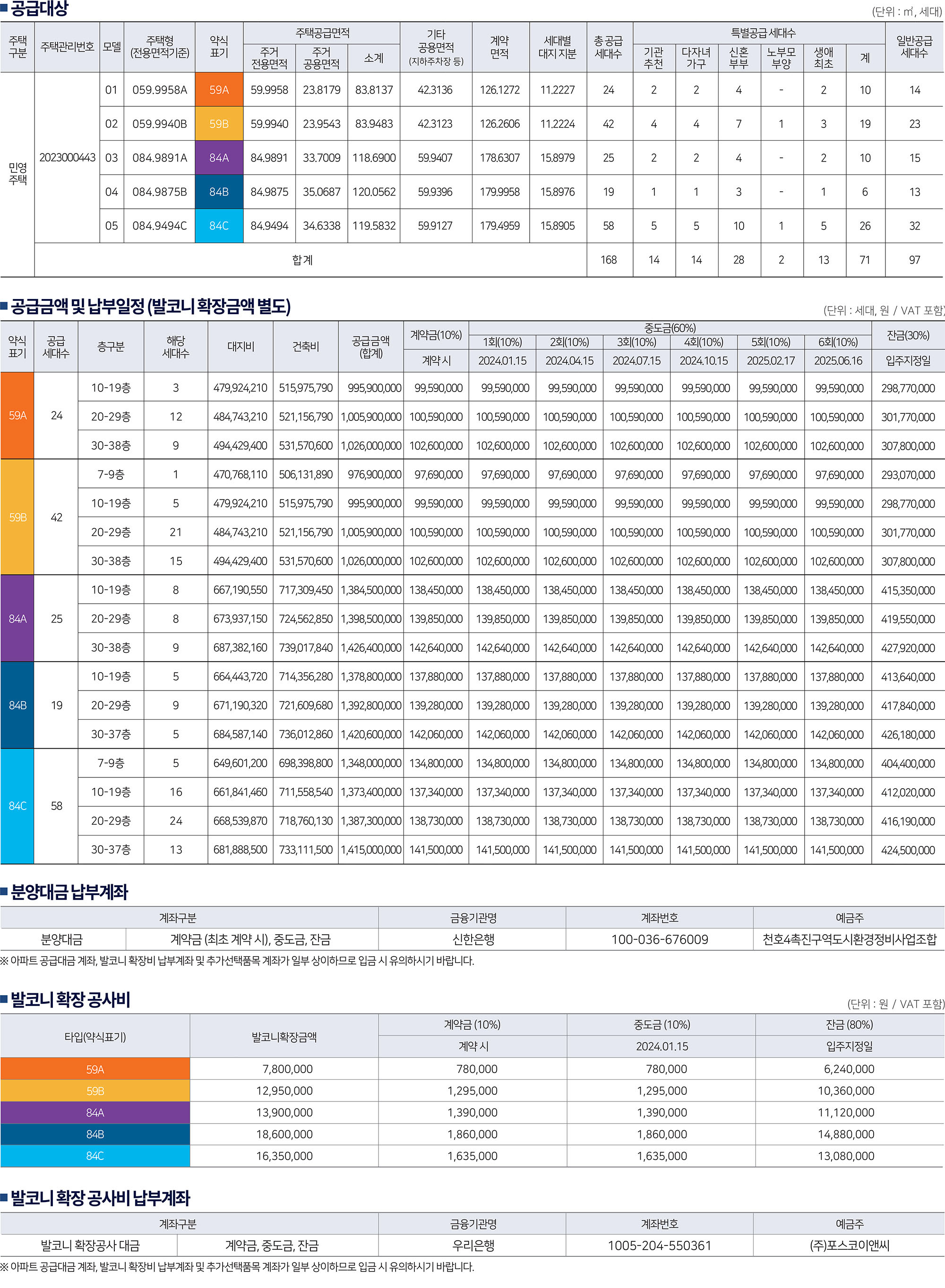 - 공급대상, 공급금액 및 납부일정 (발코니 확장금액은 별도이니 확인해주세요.)
