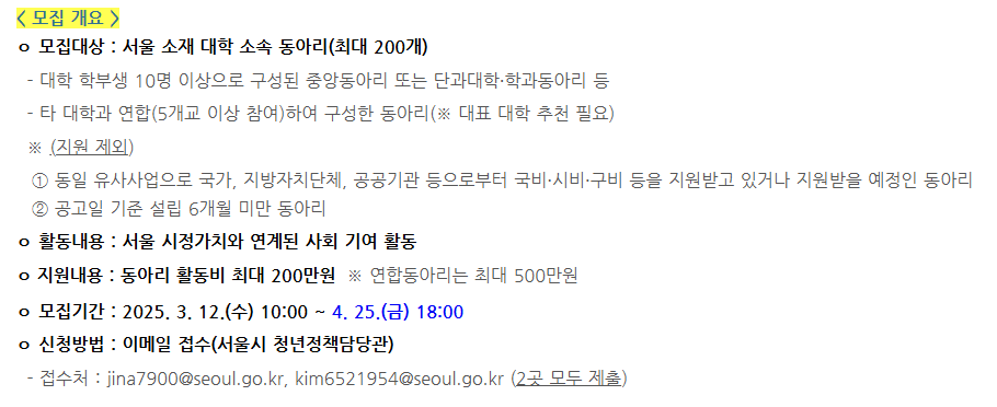[서울 동아리ON] 2025 서울시 대학생 동아리 사회기여 활동 지원사업 모집 안내