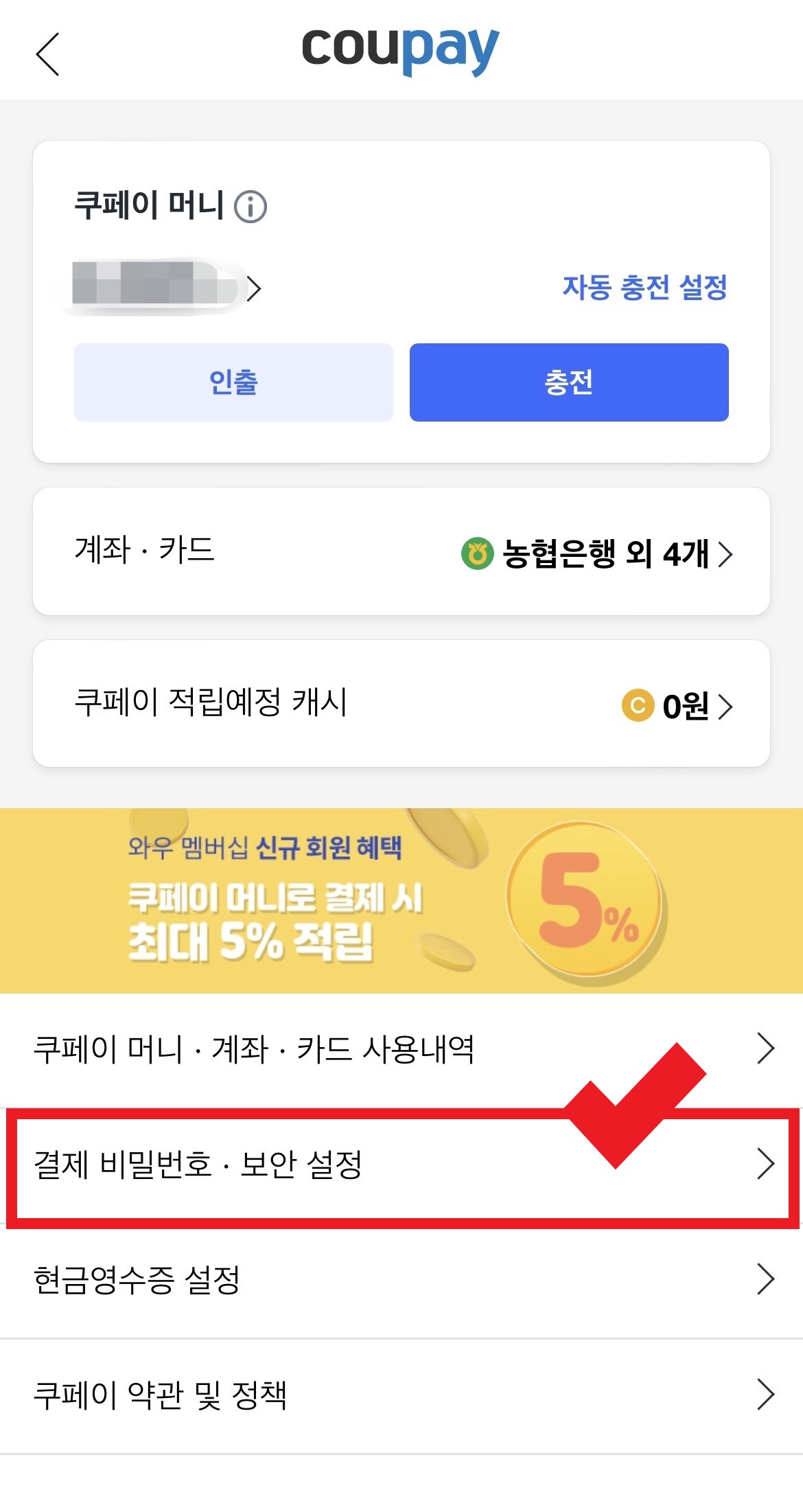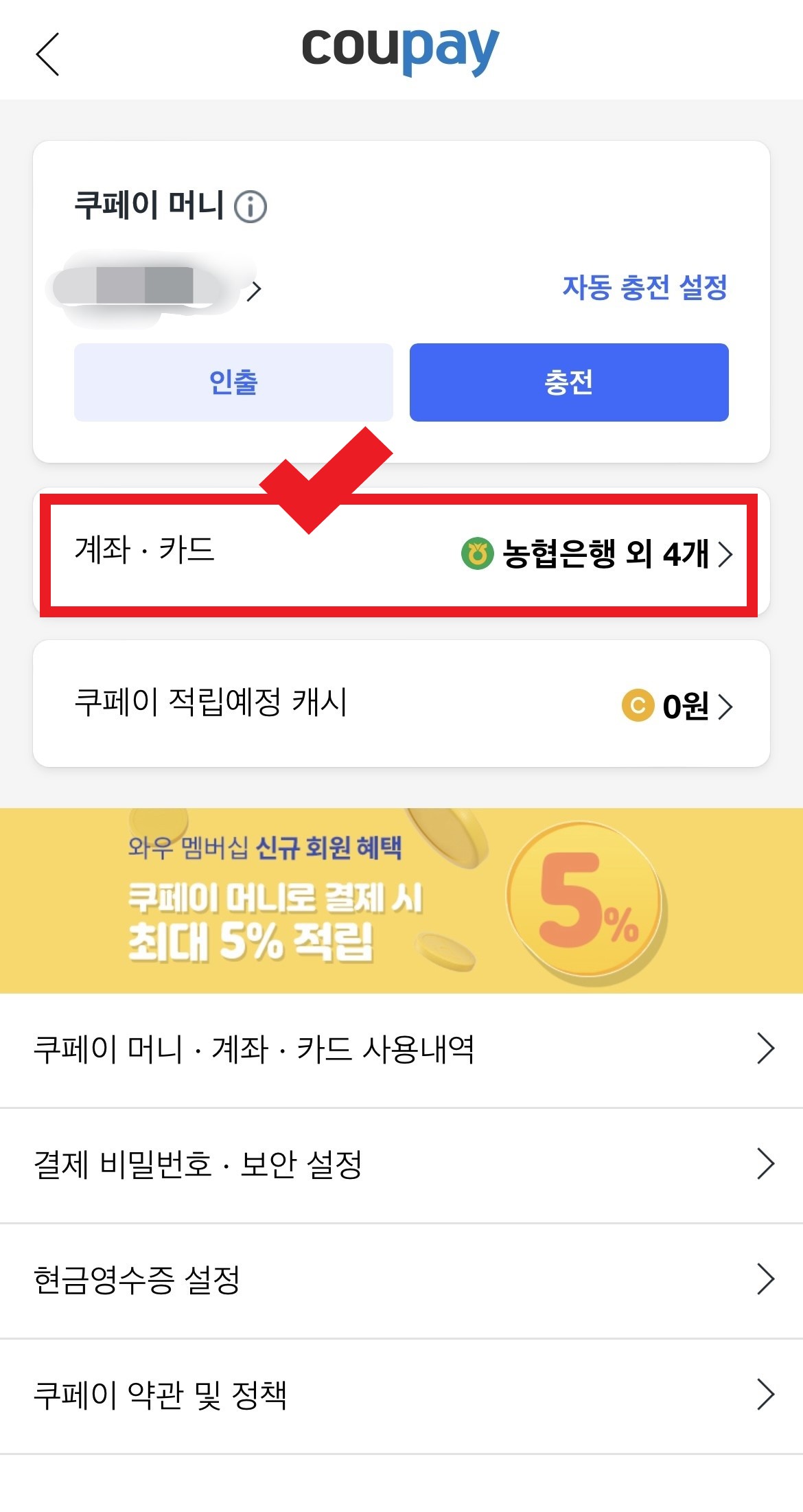 4. 그 다음 다시 나의 페이지로 돌아가 '결제수단*쿠페이'를 눌러 결제할 카드를 등록해줍니다.