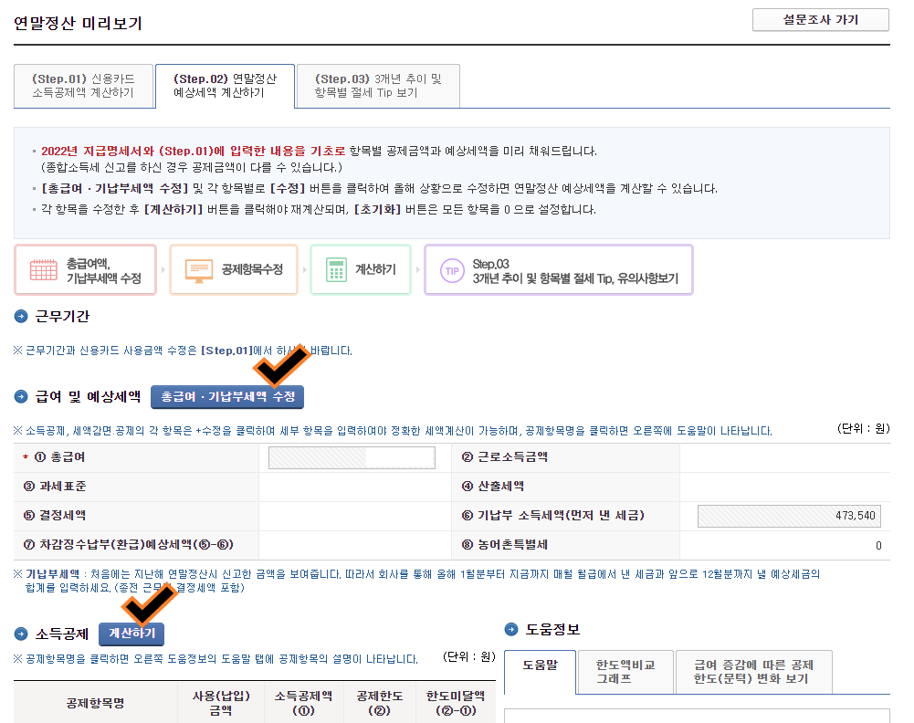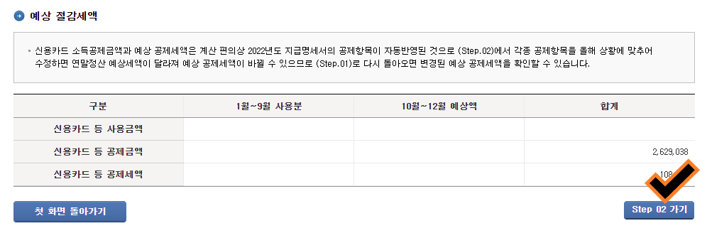 - 위 사진처럼 step. 01 신용카드 소득공제액 계산하기를 눌러주세요.