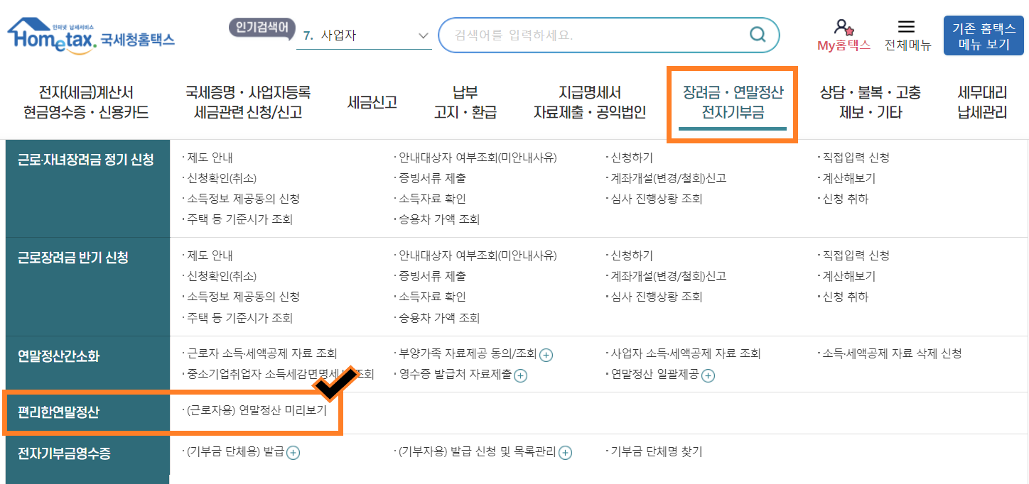 홈택스에 들어가셔서 검색창 바로 아래 '장려금, 연말정산, 전자기부금' 배너 아래에 나오는