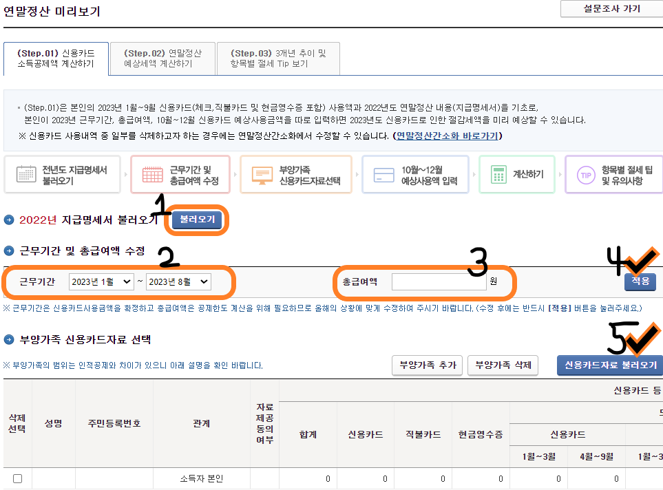 5. 부양가족이 있다면 부양가족 추가 후 신용카드 자료를 불러옵니다.