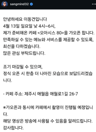 SBS [미운 우리 새끼]를 통해서 제주도 카페 창업 소식을 알렸는데요. '오아시스80'은 이동건의 출생연도인 1980년을 담아서 카페 이름을 지었다고 합니다.